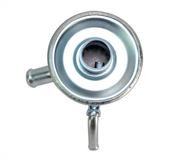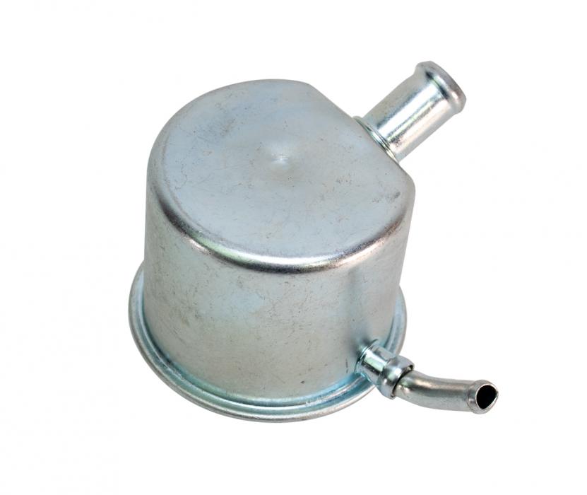 70 up OE style oil breather cap with one larger hose outlet on top and one smaller hose outlet on the bottom edge.