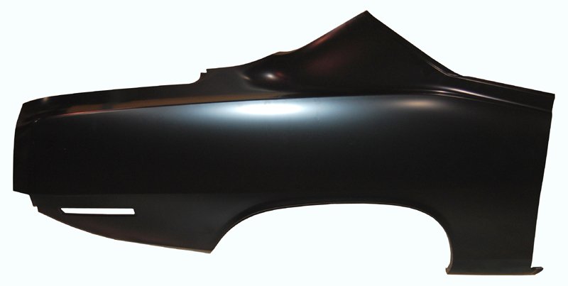 New reproduction quarter panel for the 70-71 Plymouth Barracuda Coupe. Each quarter panel is manufactured from high quality, heavy gauge steel on our exclusive new tooling and feature, depending on application, correct as original body lines, braces, marker light holes, and antenna cut-out. Unlike lesser quality competitors parts, AMD quarter panels look great and fit even better! Like all AMD parts, this quarter panel will arrive in a black EDT Coat finish and will require standard prep work prior to paint.