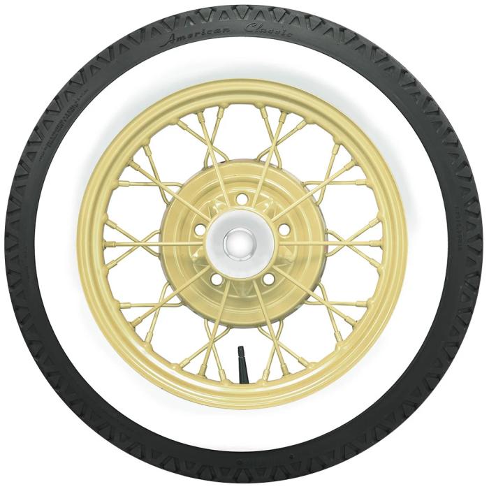 Designed to fit 1928 and 1929 Ford Model A cars and trucks, as well as other late 1920's vehicles, the new American Classic Model A+ Bias Look Radial offers the vintage look of a bias ply tire with the ride quality and safety of a modern radial tire. The 440/450R21 tire is a direct replacement for your bias ply tires, and makes a huge difference in drivability and handling. The steel belted radial is made in the USA, and offers the authentic look of a smooth white sidewall.
