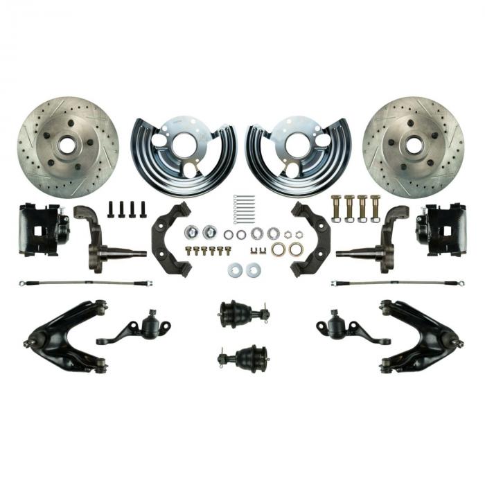 Stock Height Front Wheel Kit with Show 'N Go Upgrade featuring Drilled & Slotted Rotors, Black Powder Coated Calipers, Stainless Hoses, Backing Plates, Caliper Brackets and more for Mopar 60-76 A-Body.