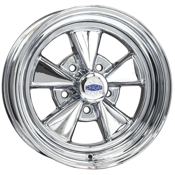 The 15x6 Cragar SS wheel is the perfect fit for a classic muscle car. The Cragar SS Series 61C features a direct drilled 5x4-inch bolt pattern, which is the small Mopar pattern found on vehicles like the Dodge Dart, Plymouth Valiant and more. You won't have to deal with uni-lug washers. Simply use bulge seat conical lug nuts and you're good to go. The 15x6 Cragar SS features 3.38 inches of backspacing, allowing it to fit under thousands of vehicles, and it will clear factory disc brake systems and some aftermarket disc brake kits (be sure to measure before you buy). You can't go wrong with the classic styling of the Cragar SS wheel, and we're proud to combine them with our extensive line of authentic tires. Cragar wheels feature a steel rim with an aluminum center, and features a show-quality chrome finish. The chrome plated center cap is included with every wheel.
