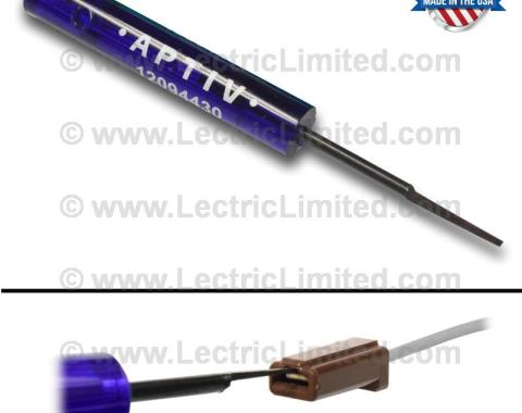 blade width.08". If you need to remove a metal terminal from its plastic connector, this genuine Aptive/Delphi tool allows you to depress & release the locking tang on most terminals used by GM from 1950-80s. Not for use with Weather-Pak…