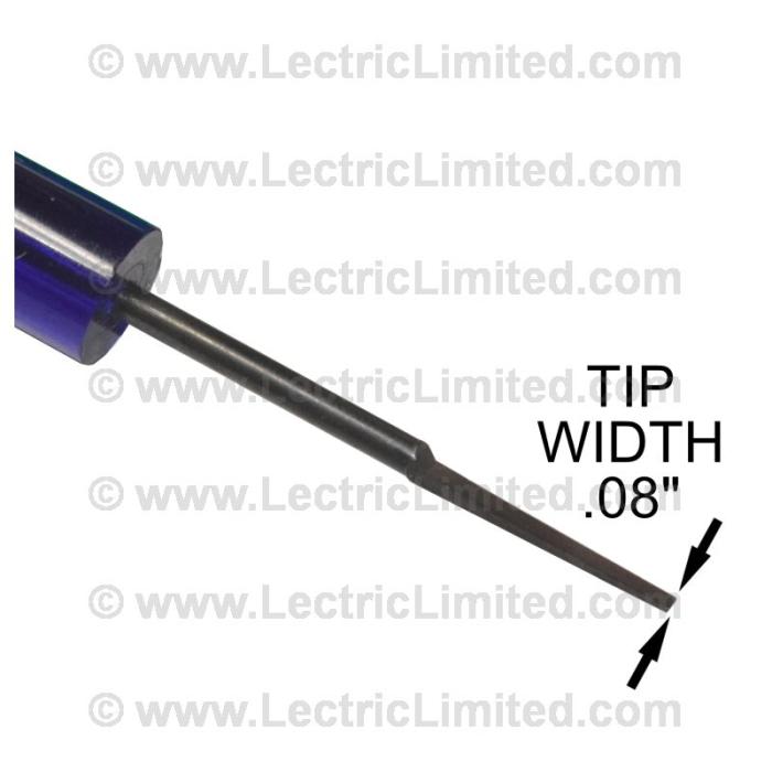 blade width.08". If you need to remove a metal terminal from its plastic connector, this genuine Aptive/Delphi tool allows you to depress & release the locking tang on most terminals used by GM from 1950-80s. Not for use with Weather-Pak terminals. Made in USA.