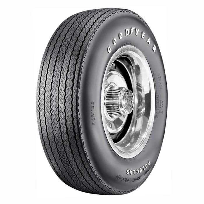 The famous Goodyear Polyglas Custom Wide Tread F70-14 features raised white letters, and the classic Goodyear tread pattern.