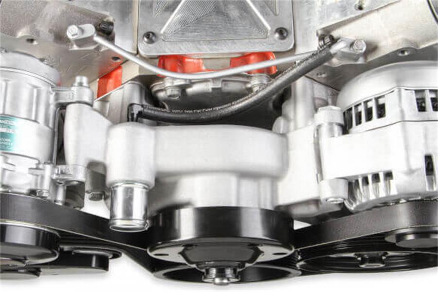 Holley's Premium Mid-Mount complete accessory system has all accessories pulled in tighter than other accessory drives. At the heart of the system is a "bracketless" design, where the accessories bolt directly to the water pump for a clean, integrated form. The design offers superb engine visibility to show off your horsepower, not your accessories. Among the many swap friendly features are bottom heater outlets for clearance in tight applications. The Holley designed alternator is just as innovative. This premium alternator utilizes 6-phase technology as found on the C7 Corvette. The water pump also shares its design efficiencies with that of the C7 Corvette. The compact and reliable SD7 A/C compressor and Type II P/S pump with baffled reservoir are also integrated. The Mid-Mount drive completes Holley's trilogy of accessory solutions giving a third option compared to the High and Low-Mount previously released. All three accessory solutions are for LS engines. When we say "complete", we mean complete. The Mid-Mount system comes with everything you need. All accessories are included; the water pump, A/C compressor, Alternator, P/S pump with reservoir, and an SFI certified damper w/hard anodized billet crank pulley. All pulleys and the belt are supplied. Even heater hose adapters, power steering to -6 AN hardline, and the alternator plug/harness are included. Easy assembly was a priority during the entire development of this accessory solution. Color graphical instructions walk you through every step of the ultra-easy installation. The Premium Mid-Mount system comes with dress up pulley covers and an SFI certified damper. Partnered with this damper is a billet 6061-T6 aluminum hard anodized crank pulley. This system is ready for the racetrack if you want to play or just be ready for anything on the street. Patent - www.holley.com/patents/