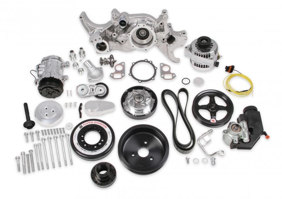 Holley's Premium Mid-Mount complete accessory system has all accessories pulled in tighter than other accessory drives. At the heart of the system is a "bracketless" design, where the accessories bolt directly to the water pump for a clean, integrated form. The design offers superb engine visibility to show off your horsepower, not your accessories. Among the many swap friendly features are bottom heater outlets for clearance in tight applications. The Holley designed alternator is just as innovative. This premium alternator utilizes 6-phase technology as found on the C7 Corvette. The water pump also shares its design efficiencies with that of the C7 Corvette. The compact and reliable SD7 A/C compressor and Type II P/S pump with baffled reservoir are also integrated.