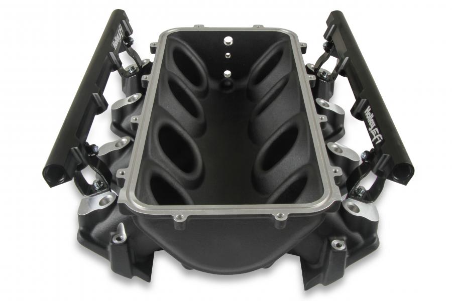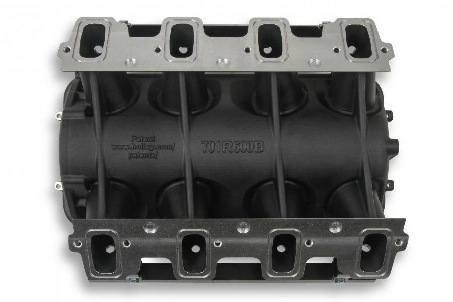 The LS3/L92 Lo-Ram manifolds top-feed base intake manifold is designed with a low height to aid the packaging of a plenum-mounted air-to-water intercooler for forced induction (supercharged or turbocharged) engine applications with peak power at 7000-8000 rpm.