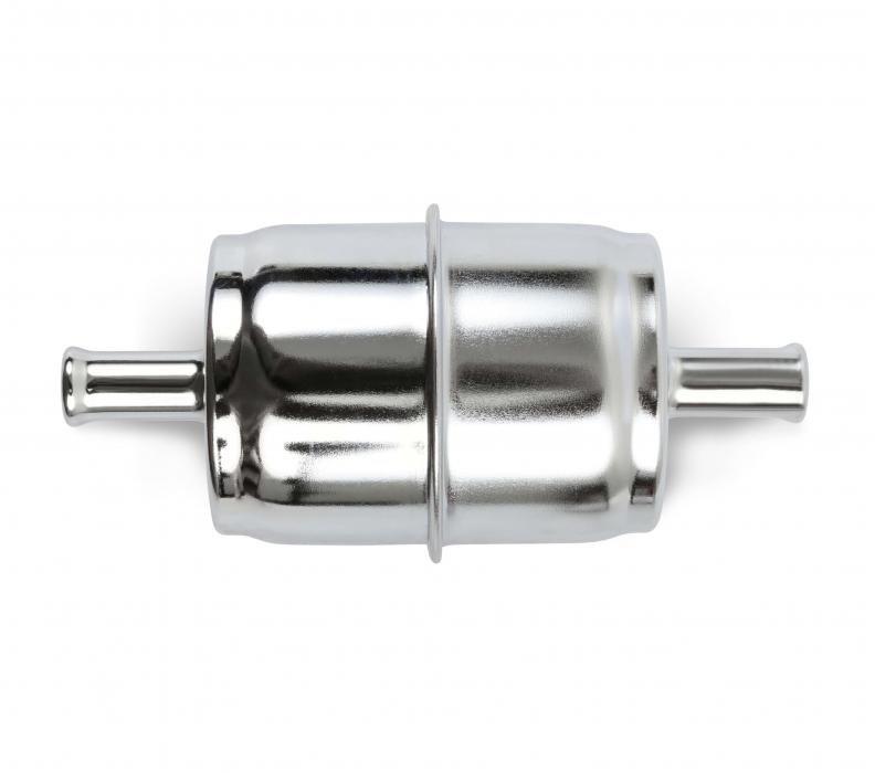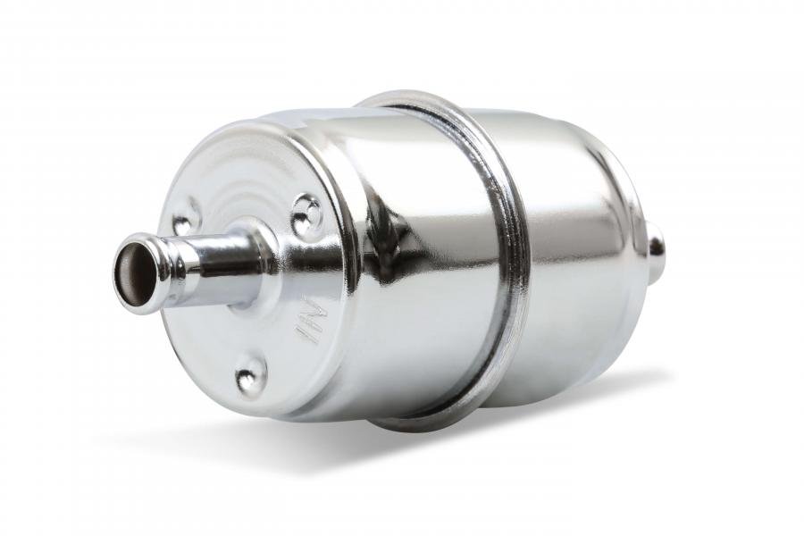 Holley chrome carbureted fuel filters are designed to be installed between the fuel pump and carburetor. A dirty fuel filter can cause many drivability issues such as low fuel pressure, loss of power, poor fuel mileage and carburetor flooding. Ensure you keep your ride in top shape with a new fuel filter from Holley.