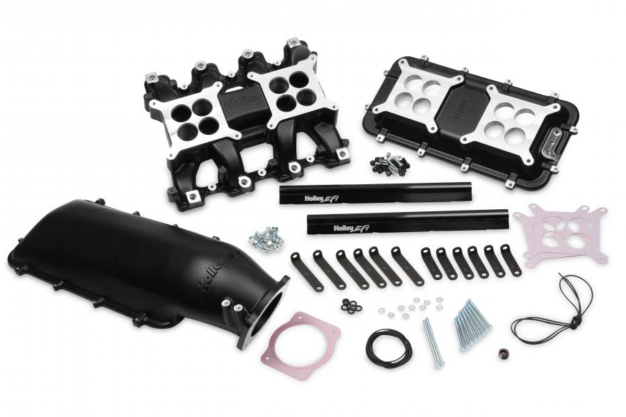 This manifold is modular, and the plenum adapter (PN 300-231) will accept all of the popular Holley LS Hi-Ram plenum tops as a foundation for custom induction systems.