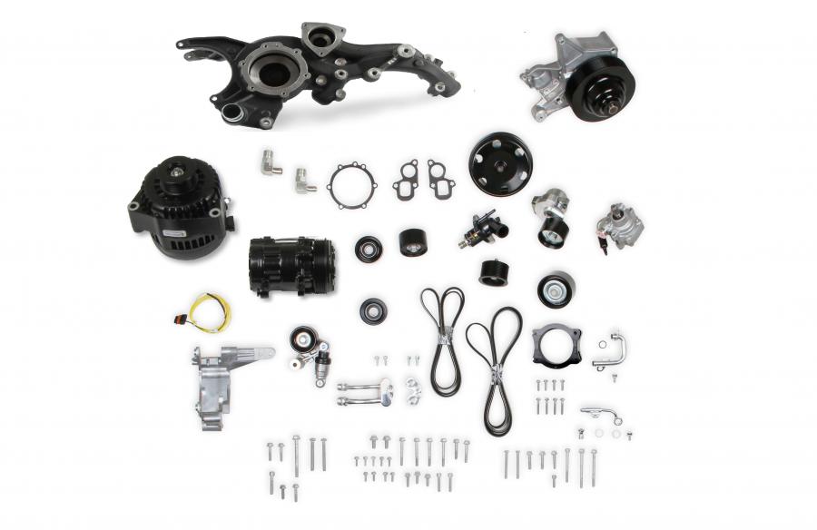 Holley's complete accessory systems for LT4 and LT5 applications have all accessories pulled up and in tight. Plus, they add the much needed hydraulic power steering solution. There are no shortcuts here. Holley incorporates a splined dual bearing system that eliminates all belt stresses on the P/S pump's internal bearings, assuring long life. The supercharger drive maintains the original and optimized belt path and tensioner. The accessory layout is as if the original manufacturer had designed it for your swap application. Included with each drive system is a throttle body angle correcting adapter that better positions the TB for swap applications as opposed to the aggressive original application intended angles. Versions of these accessory drives are available for both wet and dry sump applications. Patent - www.holley.com/patents/