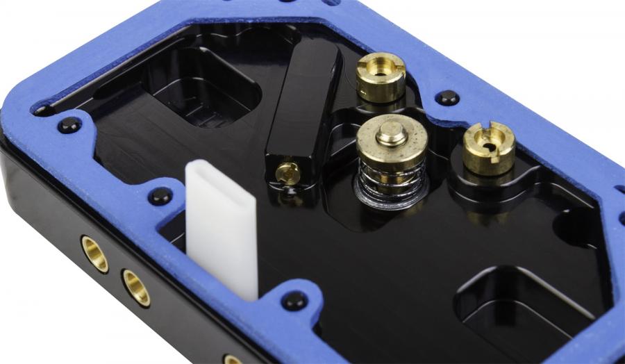 - Tumble polished aluminum with Black™ billet aluminum metering block and base plate