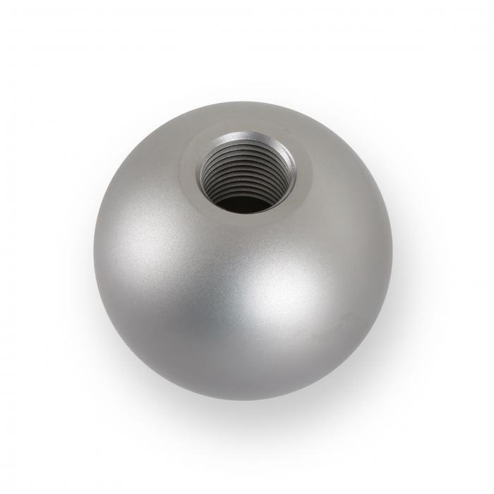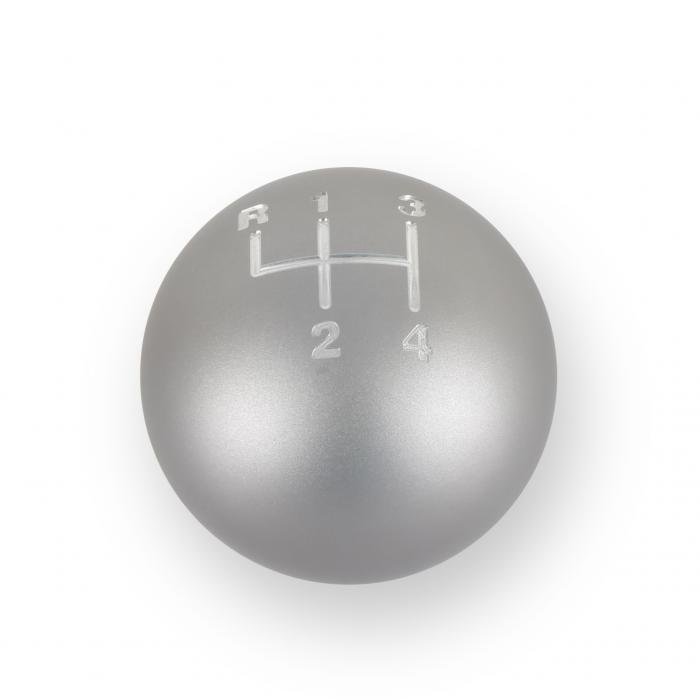 Hurst matte grey billet shift knob with a 4-speed pattern engraved. This shifter ball has a 2-inch diameter, an M16 x 1.5 thread size, and includes adapters for 3/8-16 and 3/8-24 as well as jam nuts. Similar shift knobs are available in various colors, billet or ABS, and blank or engraved 4, 5, or 6-speed shift patterns.