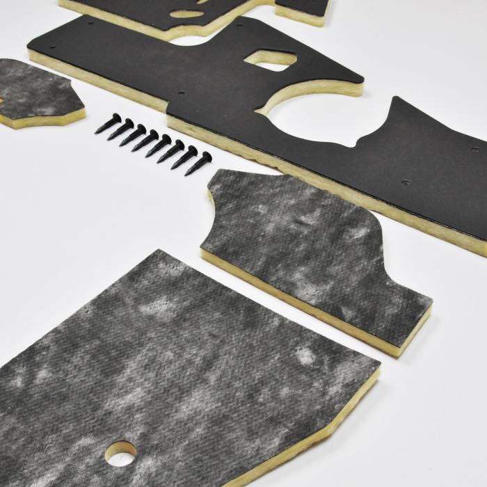 Heavy (.080") solid black cardboard with 1" yellow, "long fiber" fiberglass firewall insulation