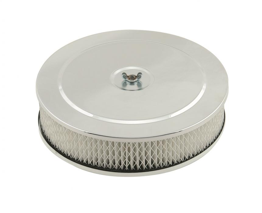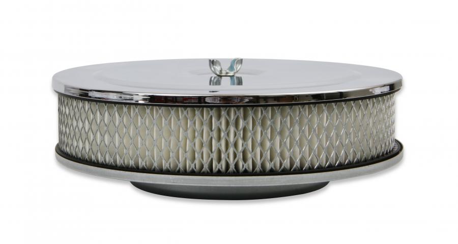 This Mr. Gasket Air Cleaner has chrome plated steel top and base. Has a high CFM replaceable flame retardant paper element. Also includes carburetor air cleaner stud and wing nut. Fits most 2,3 and 4-barrel carburetors with a 5-1/8 inch neck.