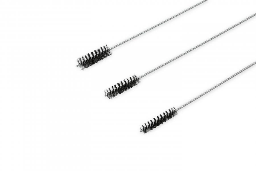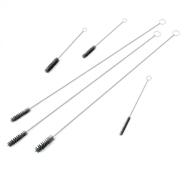 Serious engine builders and backyard mechanics alike need these special length brushes to properly clean all the holes and passages found in most automotive engines. Available in a wide variety of diameters and lengths, each brush is made from pure stiff bristle nylon that won't soften or melt when used in conjunction with most engine cleaning solvents. To minimize bending, each handle is made from heavy gauge twisted steel wire, which also firmly holds the bristles in a spiral twist. A convenient loop on the end of each brush makes for easy hanging and storage. Deluxe Brush Kit - includes one 5/16 inch, 1/2 inch and 5/8 inch o.d. (outer diameter) x 9 inch and one 1/2 inch, 5/8 inch and 3/4 inch o.d. (outer diameter)x 25 inch overall length brushes.