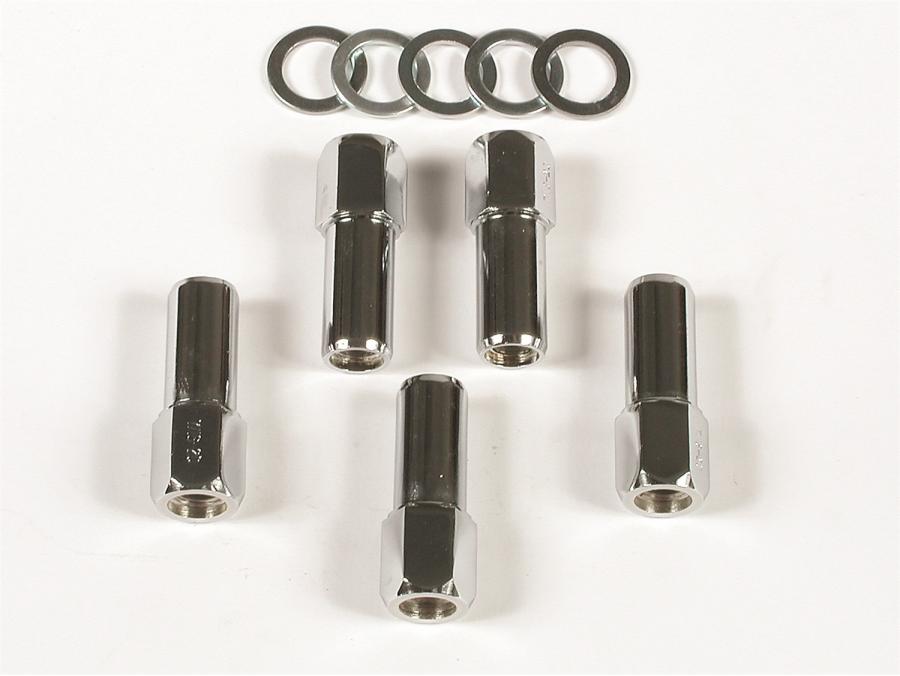 The chrome lug nut has an open-end feature that allows you to inspect thread depth. It fits most popular mag wheels and stud diameters. Five per set. Approved by major racing associations.