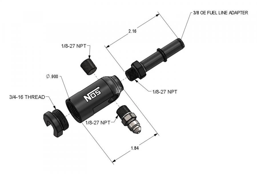 Eliminates Cutting, Drilling & Modifications When Installing Nitrous on a Late model Fuel Injected Vehicle. Simply disconnect the OE Fuel Hose and Install this Adapter Between the OE Fuel Rail and Fuel Hose. The (3) 1/8" NPT Ports Can Be Configured in Any Direction For Best Fit In Your Application. The -4 AN Adapter is Used to Feed Fuel to Your Nitrous Plate. Includes: Main Body - Fits 3/8" Tube & (3) NPT Ports 1/8" NPT Pipe Plug w/ Sealant - Steel w/ Nickel Plating 1/8" NPT Male to -4 AN Male Adapter - Steel w/ Nickel Plating OE Fuel Line Adapter 3/8" Tube x 1/8" NPT Male