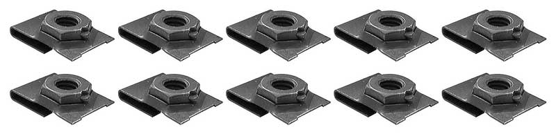 OER® Authorized reproduction J-nut that was used for the installation of various front end components including front fenders, header panels, hood latches, radiator supports, battery trays and more. Measures 5/16-18 thread. 10 piece set.