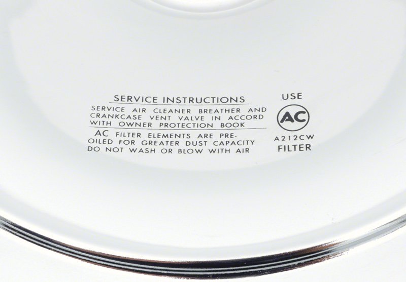 Features include "Air Filter Service Instruction" information imprinted in black on the underside of the chrome lid, in the authentic square pattern as original. Correct printing and fonts are used to ensure complete accuracy and originality.
