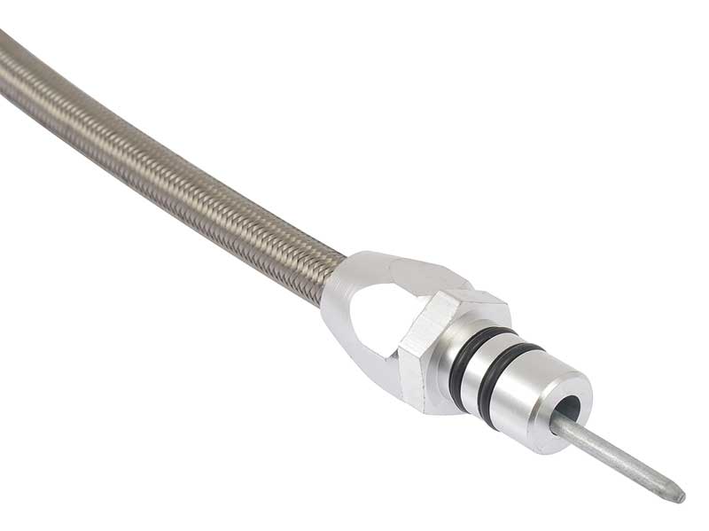Each dipstick comes complete with bra ided stainless outer housing and heat resistant E-Z to read flexible inner dipstick measuring cable. Inner cable is molded with appropriate trans fluid levels marked.