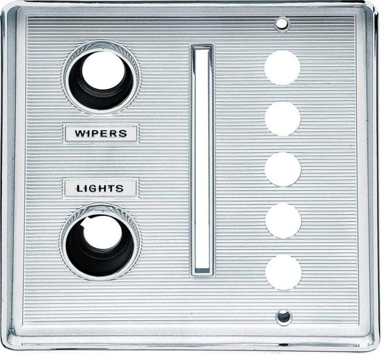 Reproduction dash switch bezel for 1964 Plymouth Barracuda and Valiant models. Mounts to the LH side of the instrument cluster bezel and features the holes for the wiper switch, headlamp switch, park brake lever and gear shift push buttons. Manufactured from injection molded plastic to factory specifications for a perfect fit and appearance.
