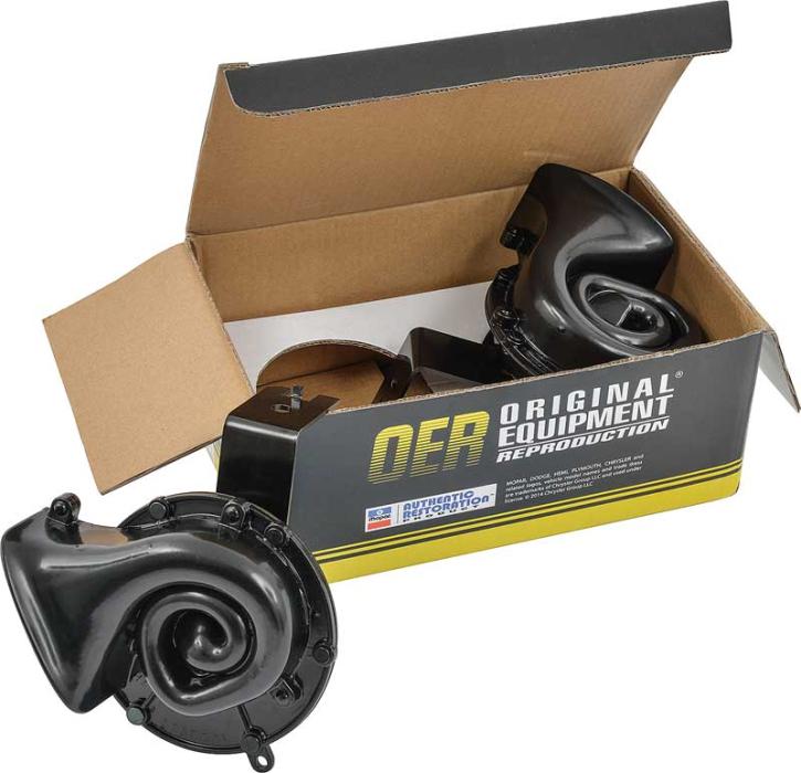 Correct OER® reproduction of the Sparton horns designed for various 1967-71 Mopar models. Each horn is designed with the Dodge and Plymouth "folded horn" design for proper sound and correct pitch. Manufactured to factory specifications featuring OEM markings and the "Sparton" logo as original. Sold as a pair with Hi / Lo horns. There were two different versions of horns that were offered during these years. Prestolite which features an adjustable style horn bracket and the Sparton style, which features a fixed style horn bracket. We offer the Sparton style horns only where the bracket is not adjustable.