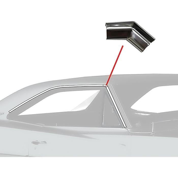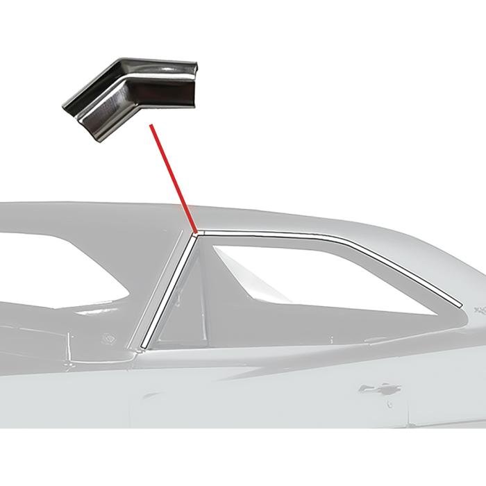 Reproduction roof drip rail molding corners for 1968-70 Dodge and Plymouth B-Body models. Each molding set is manufactured in quality stainless steel to original factory dimensions for an authentic appearance and fit. Two piece set provides roof drip corner moldings for the front corners where the A-Pillar drip rail moldings meet the moldings that mounting over the door and quarter window. Includes both RH and LH sides.
