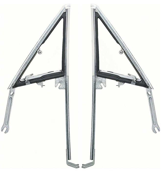 Reproduction of the vent window frame assemblies designed for various 1968-70 Mopar B-Body models except convertible. Each window frame is manufactured in die-cast metal and finished in bright polished chrome. This complete set includes the forward vent window posts, lower window frames, and upper hinge mounts with clear glass pre-installed for a convenient installation. Includes RH and LH vent window frame assemblies. Sold in pairs.
