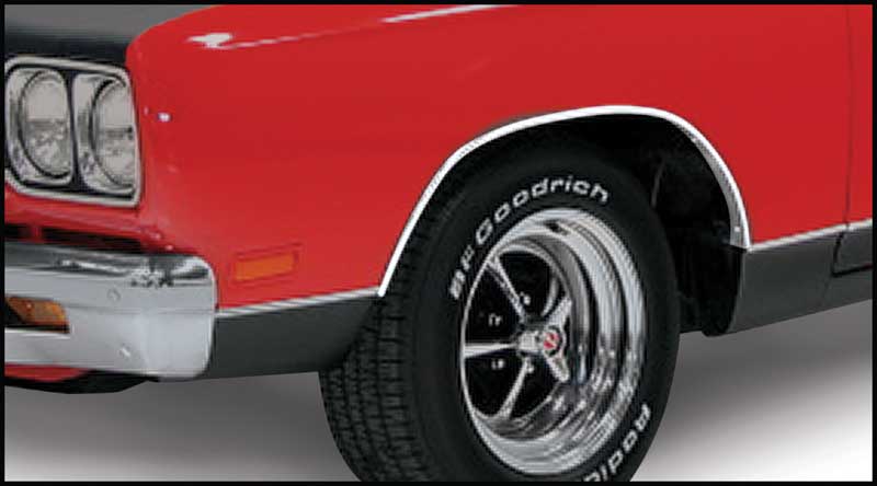 American made reproduction wheel opening moldings for 1969 Plymouth GTX models. Each molding is manufactured in quality stamped aluminum featuring correct contours for an authentic appearance and fitment. Comes as a set of 4 moldings for front fenders and rear quarter panels. Moldings are manufactured in the USA using quality American made stamped aluminum. Sold as a set of 4 moldings for front and rear. Mounting screws available separately. Refer to part number # MN2103 for screw set.