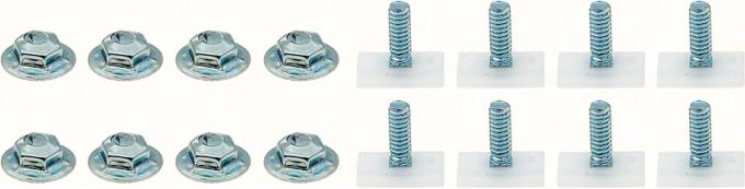 Factory-style replacement hood lip molding installation hardware for1967-69 Dart, and 1970-71 Dodge Challenger models. Each molding hardware includes proper retainers with 1/2 threaded stud and nuts to correctly secure your hood lip molding. Includes an 8 piece set. NOTE: Use for moldings MN1424, ME1556 and K3278 (not for use on # MN1426)