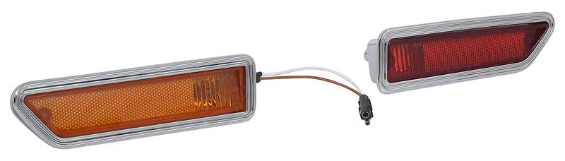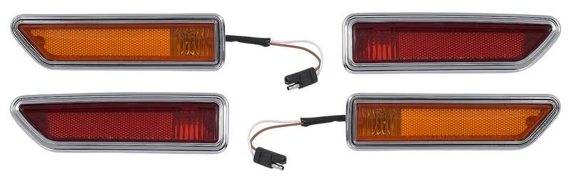 Reproduction side marker lamp set for 1970-71 Dodge Challenger models. This factory-style replacement side marker and bezel set includes the lenses, bezels, gaskets, and front pigtails to replace your damaged or missing original assemblies.