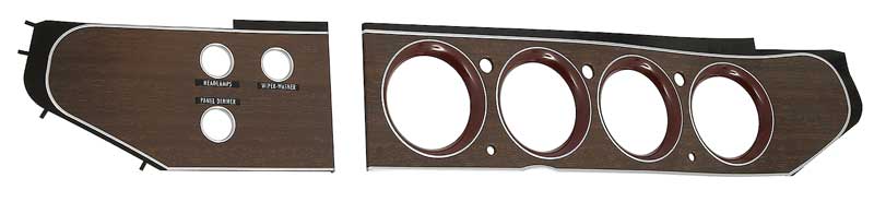 Reproduction of the original Rallye Gauge panel and switch plate designed for use on 1970-71 E-body hardtop models. Original bezels that are scratched, damaged or covered in overspray can be very difficult to repair. The woodgrain finish on this aluminum bezels is not a decal. Each woodgrain panel utilizes screened print just like the originals. 3 switch design. Note: This panel is stamped from a flat aluminum panel, minor bending of panel is necessary before installation to get proper curvature in the corner area.