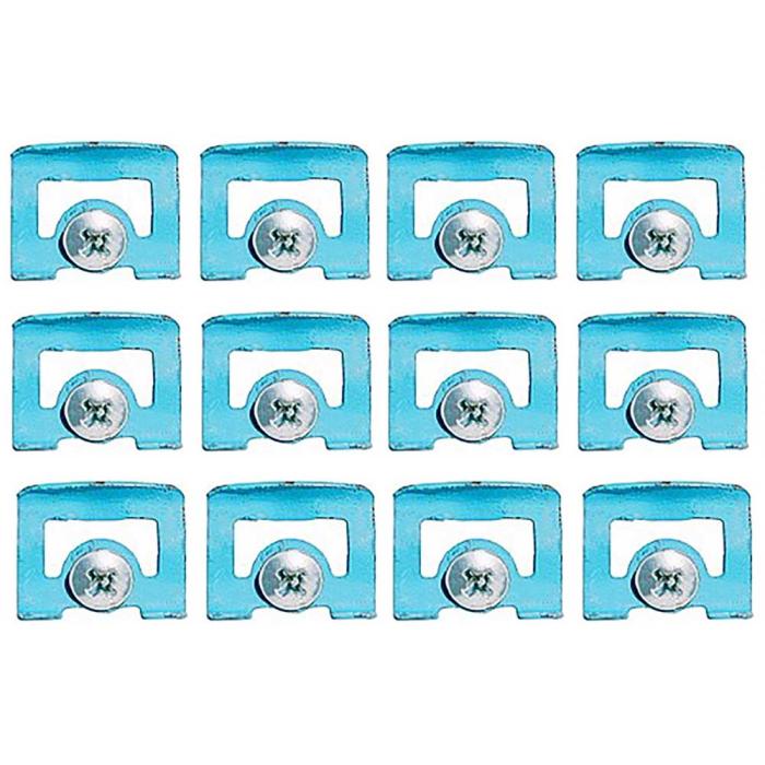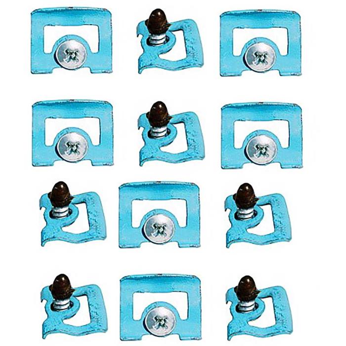 Premier reproduction windshield reveal molding clip set for Challenger and Barracuda models. This factory-style replacement front window reveal molding clip is manufactured in steel to replace the broken, cracked or rusted original and secure the molding to body of the vehicle. Sold in a set of 12 clips in light blue finish, with 12 phillips washer head bi-wax tip sealing screws, as original. For use with 2 door hardtop models.