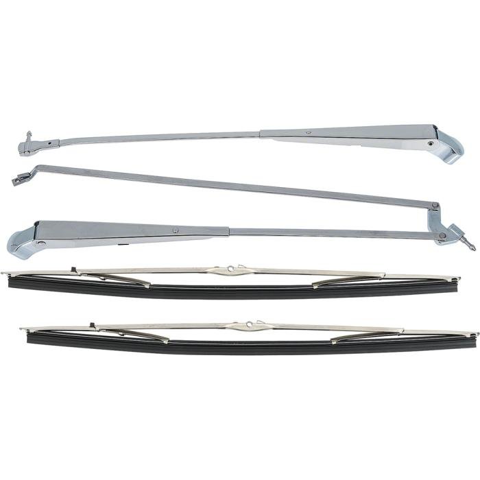 Correct reproduction of the original style Anco style wiper arms with blades designed for 1970-74 E-body Dodge and Plymouth models. Made from stamped and formed polished stainless steel with a chrome plated cap and correctly design spline. Each kit comes with Anco Style full frame, medium profile windshield wiper blades with push-button release for refill. These 16" Anco style wiper blades are manufactured from stamped stainless steel with a quality molded rubber insert. Each blade is a reproduction of the vintage Anco 21-16 series blade in stainless steel. Sold as a 4-piece set including (2) wiper arms, and (2) wiper blades.
