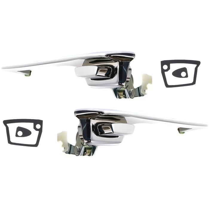 Reproduction outer door handles for various 1971-76 Dodge and Plymouth A-Body models and 1972-93 Dodge D/W Series trucks. Each door handle is manufactured in quality die-cast zinc featuring a polished chrome finish replicating the original in design, appearance, and fitment. Each set comes completely assembled and are ready to install. Features chrome handle with a chrome thumb-operated button.