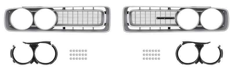 OER reproduction of the 1971 Charger LH & RH grill assembly. Manufactured in gray injection molded plastic, and finished in argent silver, in the accent areas just like the original factory item. Rubber headlight shield and headlight shield mounting hardware are included. Some assembly is required. This is the silver version of the grill for higher trim level Charger models without concealed headlamp option, with silver grills.