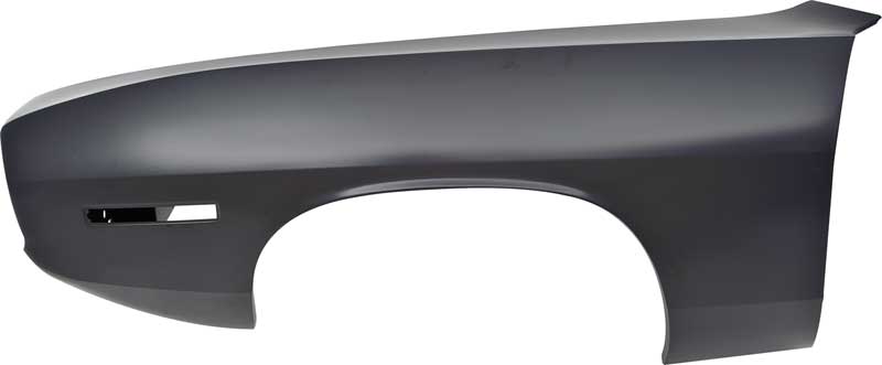 Reproduction of the original front fender panel for use with 1971 Plymouth Barracuda models. Each front fender is manufactured in quality stamped steel to factory specifications replicating the original curves and configuration offering an authentic replacement. Includes correct side marker lamp cut-out section. Comes with black EDP coating for rust and corrosion prevention.