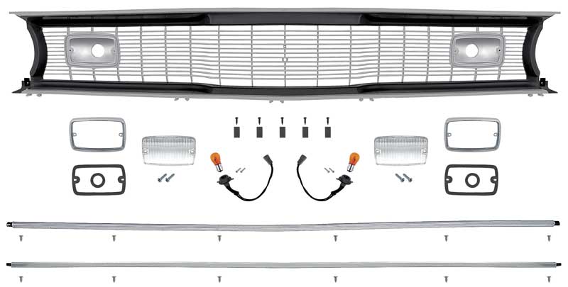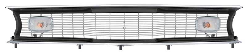 This OER reproduction grill assembly designed to replicate the 1970-72 Plymouth Valiant, Duster, and Scamp grill. Each grill is injection molded as original and designed to exact specifications of the original. This grill is molded in black plastic as original, featuring a black surround and argent silver painted grill bars. This grill assembly includes center grill , upper and lower grill molding, park lamp lenses and gaskets, park lamps bezels, park lamp sockets and pigtails, park lamp bulbs, and lower grill retaining clips for easy "bolt-in" installation.