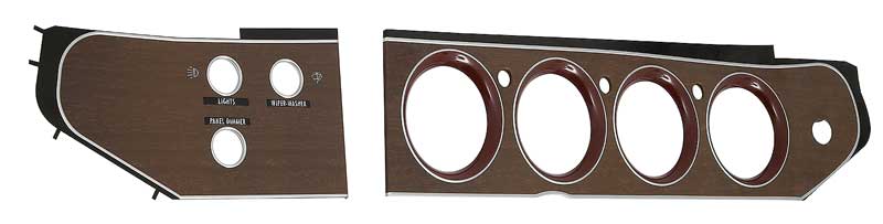 Reproduction of the original Rallye Gauge panel and switch plate designed for use on 1972-74 Plymouth Barracuda, Cuda, and Dodge Challenger hardtop models. Original bezels that are scratched, damaged or covered in overspray can be very difficult to repair. The woodgrain finish on this aluminum bezels is not a decal. Each woodgrain panel utilizes screened print just like the originals. 3 switch design. Note: This panel is stamped from a flat aluminum panel, minor bending of panel is necessary before installation to get proper curvature in the corner area.
