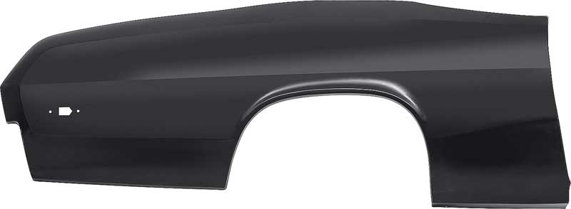 Reproduction of the original quarter panel skin designed for use with 1972-76 Dodge Dart Sport, 1972 Demon and 1972-76 Plymouth Duster models. Each partial quarter skin panel is manufactured in stamped steel to original factory specifications featuring correct contours for an authentic appearance and fit. The partial quarter panel skin extends to the top crease of the original quarter panel and is die-cut so it extends to all mating surfaces including door jamb, wheel house and tail light / valance panel area. The panel includes pre-cut rear side marker cut-out in correct location. Comes with black EDP coating for rust and corrosion prevention.
