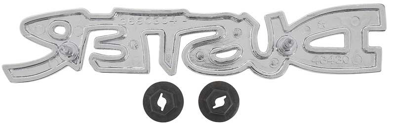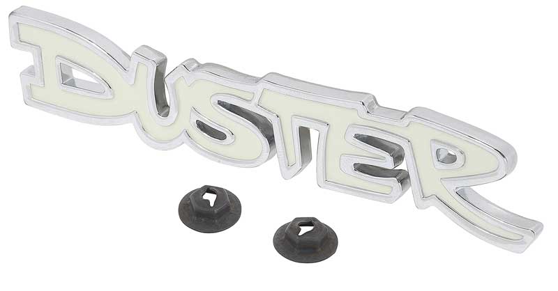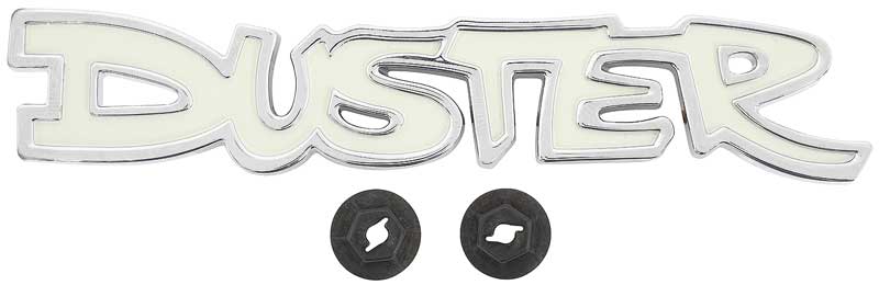 OER® reproduction of the original "Duster" pin-on style front fender and rear panel emblem designed for use with 1972-76 models. Each emblem is a die-cast reproduction of the original including a chrome border with white lettering. Emblem includes all original Chrysler markings, part numbers and pentastar insignias on the back of the emblem offering complete originality and authenticity. Sold individually. 3 required per vehicle. Includes mounting hardware (speed nuts).