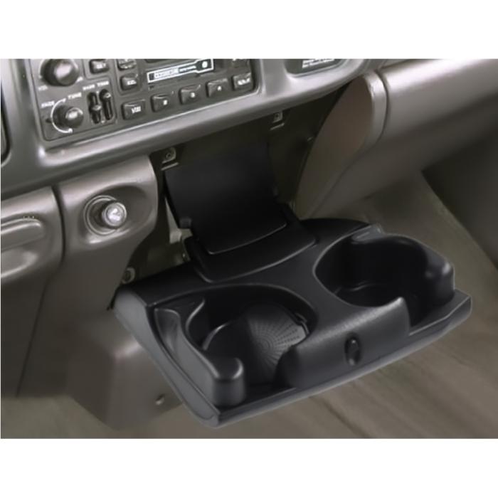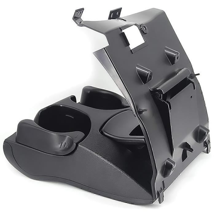 Reproduction dashboard cup holder for 1998-02 Dodge Ram Trucks. This foldable dual drink holder mounts on the dashboard, in the center of the dash below the radio and to the right of the cigarette lighter. Replaces OE number # 5FR421AZAE. Black in color.