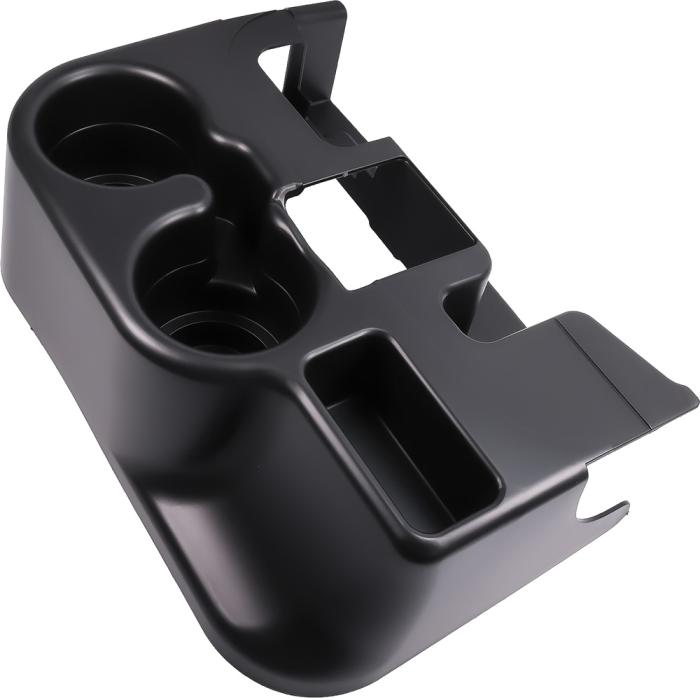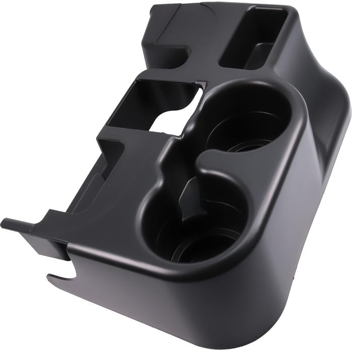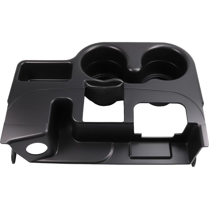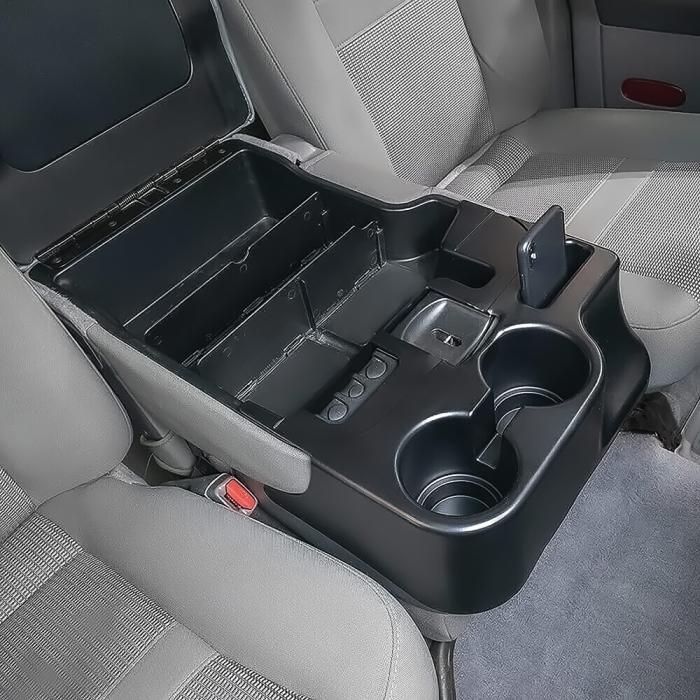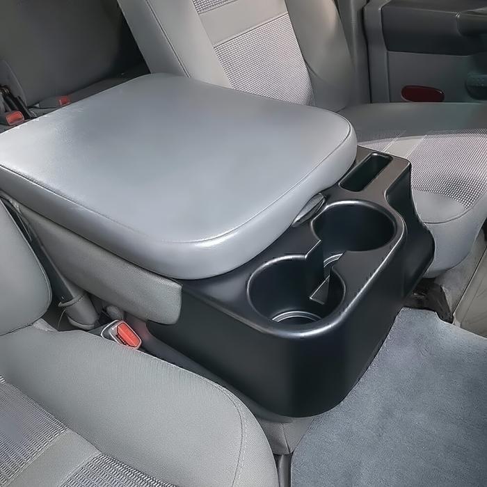 Center console cupholder and organizer accessory attachment for the console lid or armrest on 2003-2012 Dodge Ram 1500, 2500, 3500 models. Expands the capacity of the console and provides space for securing two standard sized beverage cups.