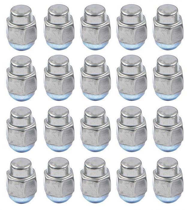 The design of the nut is the same as the original with a stainless cap over steel nut construction. Will install on original or reproduction wheels. Comes as a set of 20.