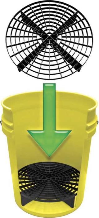 The Grit Guard insert sits in the bottom of the pail to extract particles and contaminants from mitts and brushes. Gravity causes sand and dirt to settle below the guard so the wash water stays scratch-free clean.