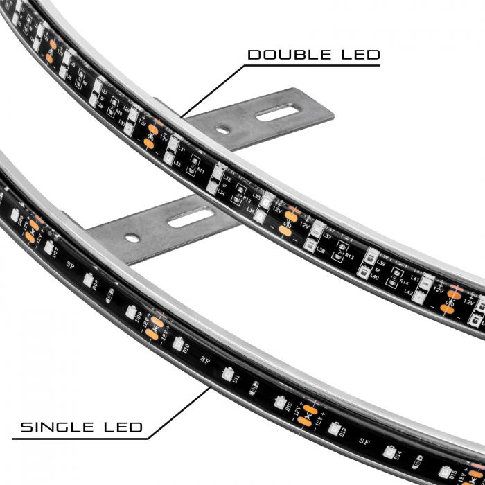 NEW! Double the LEDs. Double the Brightness! Are you looking for the brightest and most attention-grabbing LED wheel ring kit on the market? Look no further than the all-new Double-Wide LED Wheel Ring Kit from ORACLE Lighting! With over 600 LEDs these rings make a powerful impact on any vehicle! The all-new design features Plug and Play waterproof connectors for easy installations. Each ring has over 12" of insulated cable that connects to a wiring hub which makes installation easier than ever. The rings now include (5) mounting brackets per ring and have tapped fittings to easily move and adjust brackets to fit any application. The ring diameter has been increased to 16.5" to fit oversized performance brake systems. ORACLE Lighting illuminated LED wheel rings are an easy and effective way to light up your truck's wheels and suspension! This head-turning lighting product consists of a set of (4) LED illuminated aluminum rings which install around the brake rotor and attaches to the brake dust shield. These can also be mounted to older vehicles with drum brakes. The effect is a large ring of light which accents custom wheels and stands out at events. Oversized 16.5" diameter is the largest on the market and fits oversized brakes. Each ring is equipped with 162 super-bright 2835 LEDs (648 LEDs total) which will outshine any competitors.