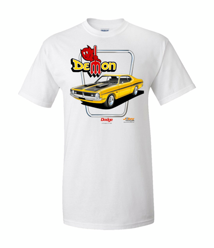 White '71 Demon Shirt - Our Automotive designs are printed on cotton Gildan t-shirts. Each fully licensed design is unique and distinctive and will give a motorhead the edge he needs when there is simply no other way to say it!