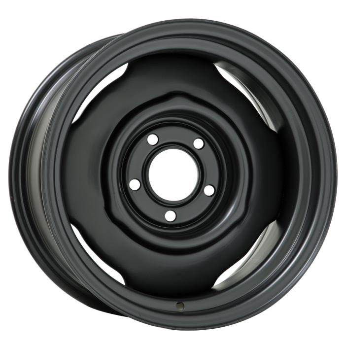 The 63 Series O.E. Chrysler wheel come with a standard durable satin black powder coat finish. New Chrysler Steel Wheels offer reliable rolling stock for your restoration project. The wheels accept 8.75" outside knob center caps and are offered in popular Mopar bolt patterns.